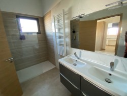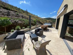 Somptueuse villa de 230 m2, construite en pierre de schiste, alliant design contemporain, confort absolu et prestations haut de gamme. Trois suites parentales avec dressings, espace coiffeuse et salles de bain ou douche à l’italienne, équipées d’un mobilier de qualité et agencé avec raffinement, s’ouvrent sur une terrasse offrant une vue panoramique spectaculaire sur la mer et les montagnes. Une buanderie entièrement équipée complète l’ensemble.