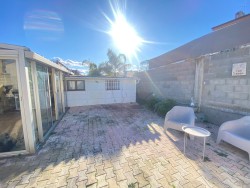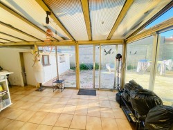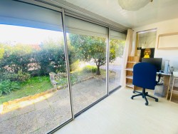 La cuisine indépendante équipée ouvre sur une véranda couverte et lumineuse, exposée plein sud, avec de larges baies vitrées donnant sur un jardin plat sans vis-à-vis, agrémenté d’un espace barbecue.